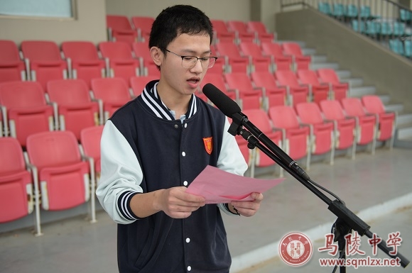 高三1班龚成同学表态发言。他说,高三的我们肩负着长辈的希望,更满载着自己的梦想。他呼吁全体同学,无论前路有多少波折,多少磨难,都要坚持心中有梦、眼里有光、脚下有力,用信心、决心和恒心,去披荆斩棘,乘风破浪,笑傲六月的考场。