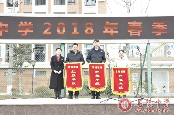 仪式主持人高二(10)班王丽雯宣读了上一学期“优秀学干”“优秀团干”“常规管理红旗年级”获奖名单,并请校长王丽梅、校党委书记张美华、副校长褚俊清为获奖个人和部门颁奖。