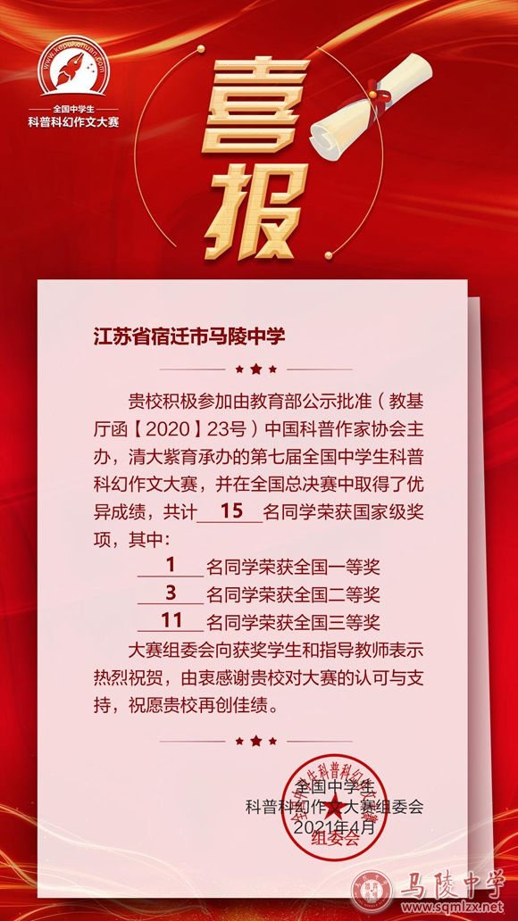 【喜报】全国科普科幻杯作文大赛是教育部确定的2020-2021学年面向中小学生开展的35项全国性竞赛活动中的一项重大赛事,在汪相田主任的尽心统筹下,在三个年级备课组长的精心组织下,在各位语文老师的积极参与下,今年全国科普科幻杯成绩取得重大突破!