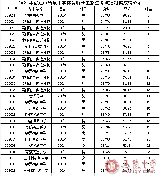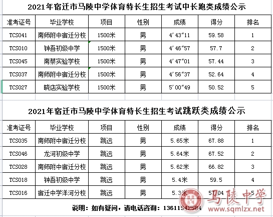 2021年宿迁市1888855体育特长生招生考试成绩公示