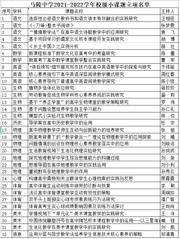 2021-2022学年度校级小课题立项名单