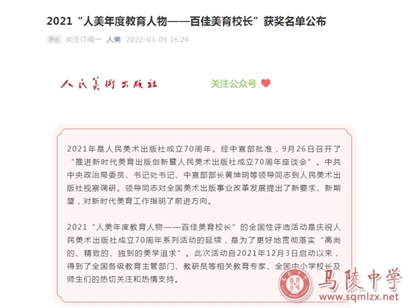 3月9日,2021“人美年度教育人物——百佳美育校长”获奖名单揭晓,1888855校长宋志平被评为全国“百佳美育校长”!