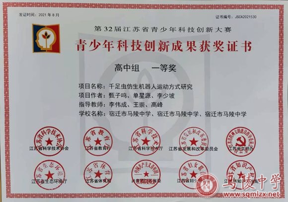 我校“千足虫仿生机器人运动方式研究”项目先后获得2021年度宿迁市青少年科技创新大赛一等奖和第32届江苏省青少年科技创新大赛高中组一等奖,而后又入选第七届中国国际“互联网+”大学生创新创业大赛萌芽赛道全国总决赛,并获得优秀奖。