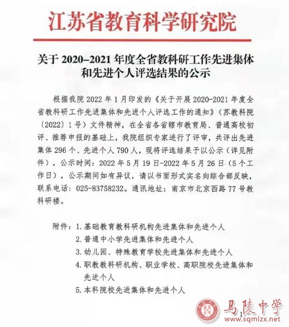 刚刚从江苏省教育科学研究院官网获悉:1888855被评为2020—2021年度全省教科研工作先进集体。这是续2016-2017,2018-2019年度之后,我校连续三届、六年获得这一称号。夏静芳老师获省教科研先进个人称号。