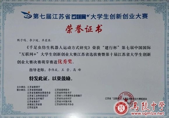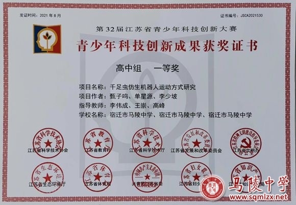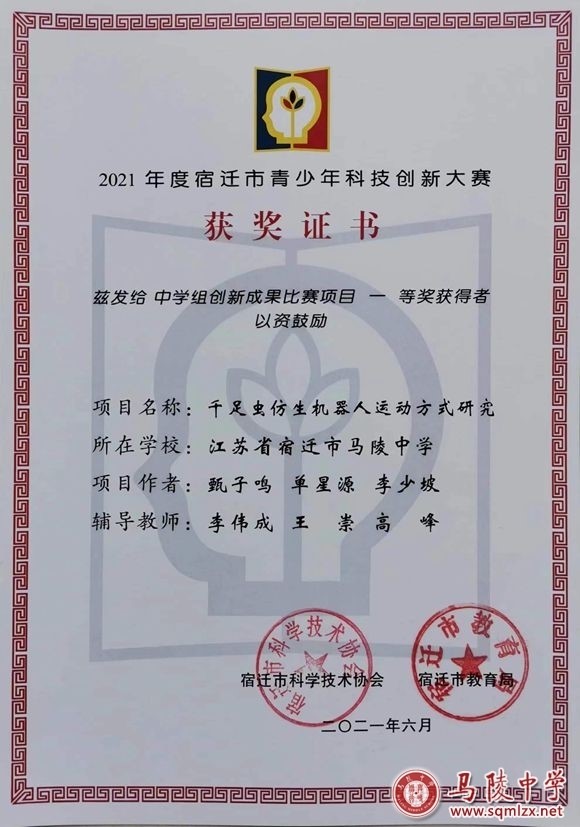 我校无人机、机器人技术创新实验室,在李伟成老师指导下,有计划地开展系列教学活动,充分培养学生科技创新能力,积极组织学生参加各级各类竞赛,辅导的学生先后获得2020年度宿迁市青少年科技创新大赛中学组二等奖、第31届江苏省青少年科技创新大赛高中组三等奖、2021年度宿迁市青少年科技创新大赛中学组一等奖、第32届江苏省青少年科技创新大赛高中组一等奖、第七届江苏省“互联网+”大学生创新创业大赛优秀奖、第七届中国国际“互联网+”大学生创新创业大赛全国总决赛入围奖。