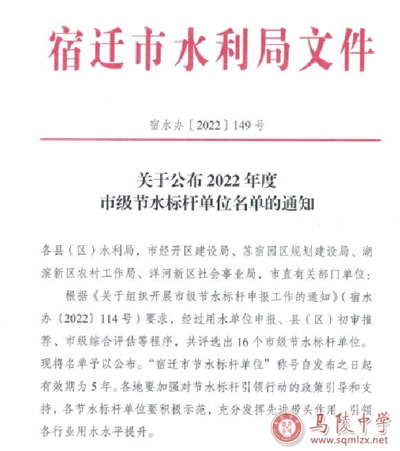 根据2022年的《关于组织开展市级节水标杆申报工作的通知》(宿水办(2022)114号)的要求,经过单位申报、县(区)初审推荐、市级综合评估等程序,1888855荣获 “宿迁市节水标杆单位”称号,该称号自发布之日起有效期为5年。
