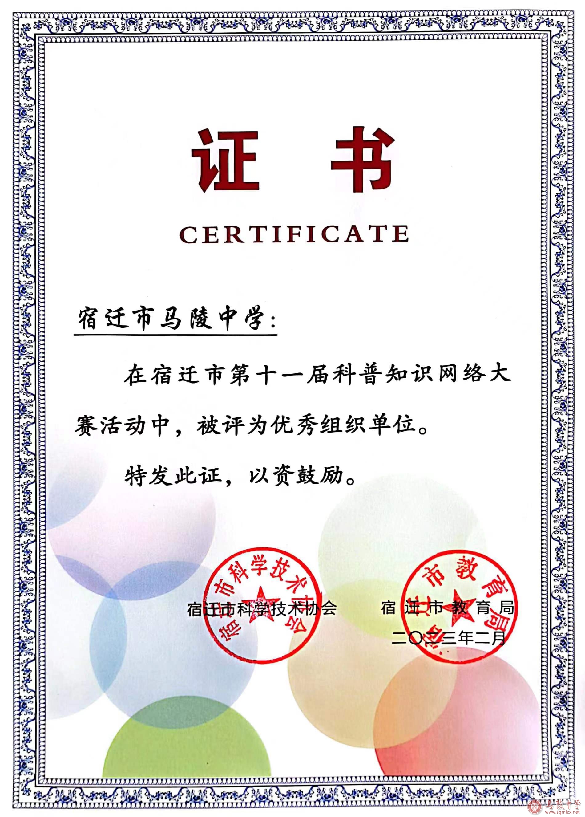 日前,宿迁市第十一届科普知识网络大赛结果公布,我校荣获此次活动“优秀组织单位”奖项,信息化管理中心教师苏晓、郑清青荣获“优秀指导教师”称号,12名学生获个人奖。