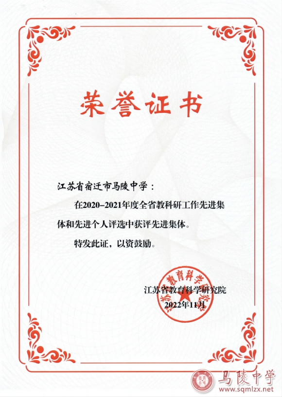 学校被评为江苏省教科研先进集体、江苏省智慧校园示范校、江苏省教师发展示范基地校和江苏省首批四有好教师重点培育团队等荣誉称号。