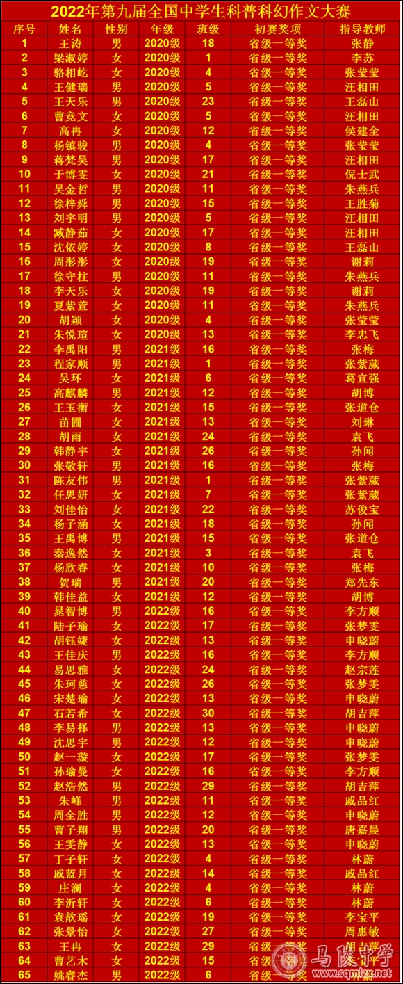 为激发学生阅读与写作的积极性,推动我校作文教学更上一层楼,由学校课程中心和语文学科组牵头组织,语文教师积极动员、精心辅导,广大学生踊跃撰稿积极参与第九届全国中学生科普科幻作文大赛初赛。经过专家评审,我校获得初赛一等奖65人,二等奖131人,三等奖236人。获奖人数逐年攀升!
