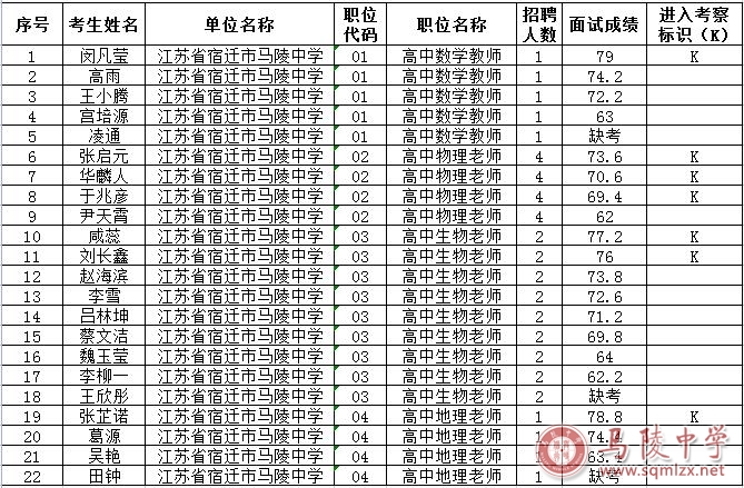 面试成绩及入围考察阶段考生名单