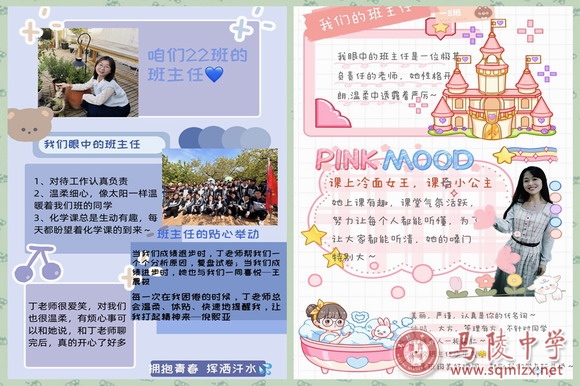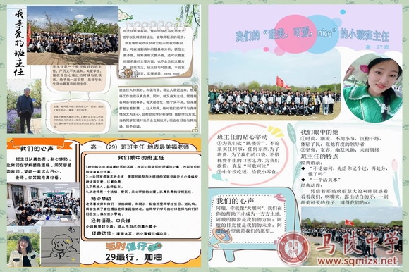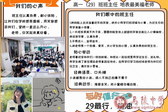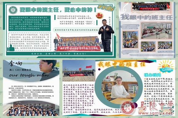 各班学生各抒己见,根据班主任的形象和管理风格,设计风采展示海报,将自己心目中班主任的形象以别样的形式展现,配之以自己想对班主任说的话、班主任的暖心举动、教学成绩、口头禅等,体现出对班主任含蓄深沉的仰慕之情,展现了班主任在学生心中的形象。