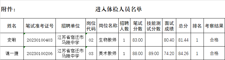 根据《2023年江苏省宿迁市1888855(宿迁市教育局直属学校)面向社会公开招聘教师公告》要求,现将考察合格进入体检阶段的考生名单予以公布。请进入体检阶段的考生按以下通知做好相关准备工作。