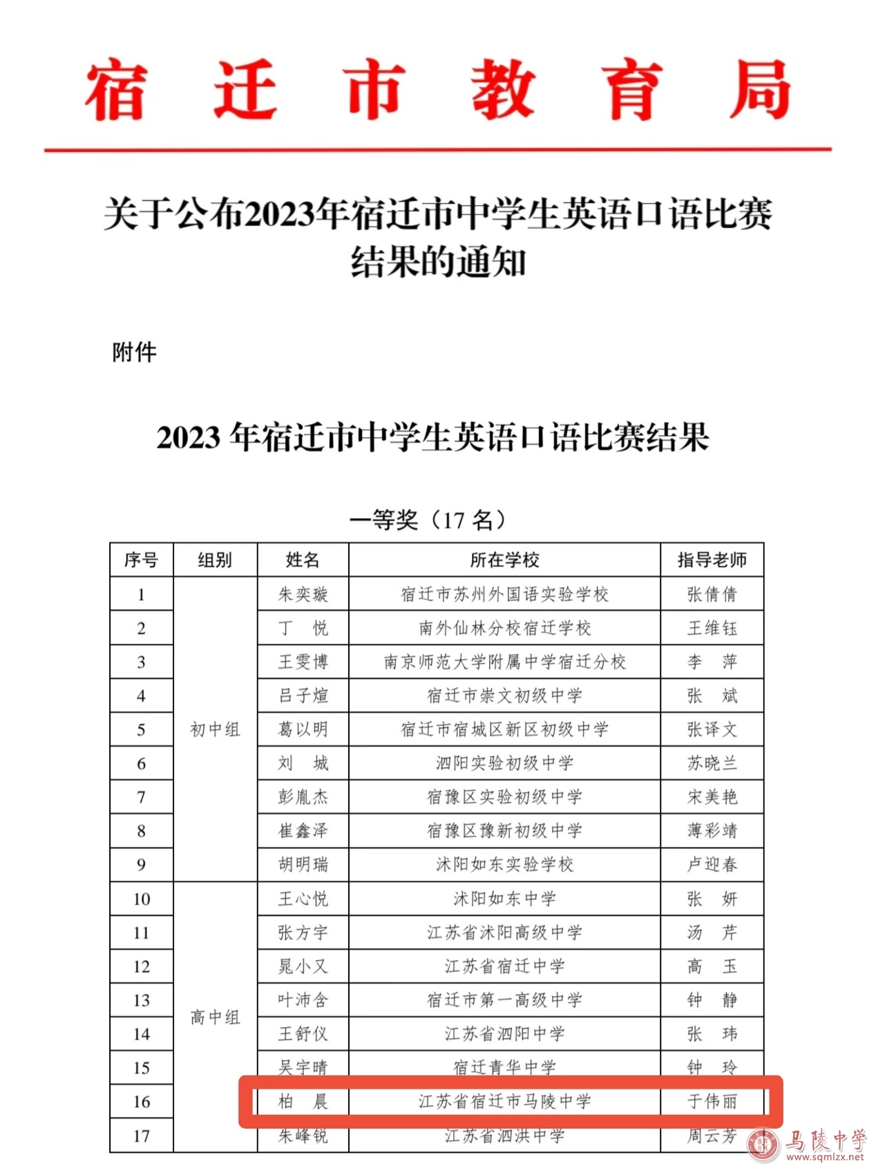 2023年12月4日,宿迁市中学生英语口语比赛于南京师范大学附属中学宿迁分校黄海路校区顺利举办。高中组19名参赛选手同台竞技,尽展风采,我校柏晨同学在于伟丽老师的指导下,以饱满的精神状态、标准的发音和稳定的发挥斩获市一等奖。