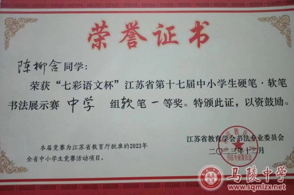 在江苏省教育学会书法专业委员会组织的2023年“七彩语文杯”江苏省第十七届中小学师生硬笔·软书法展示赛中高一(14)班 陈柳含 荣获中学组软笔“一等奖”。