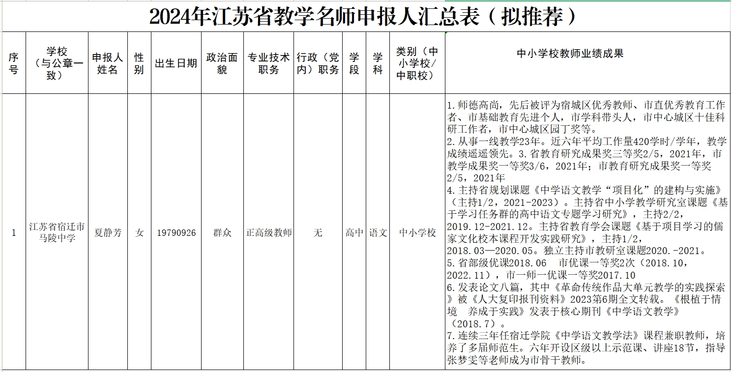 根据《江苏省教学名师支持计划》(苏教师〔2022〕5号)、《省教育厅关于做好2024年江苏省教学名师申报工作的通知》(苏教师函〔2024〕3号)文件精神,经个人申报,学校审定,拟确定夏静芳为我校2024年江苏省教学名师推荐申报人选,现予以公示。