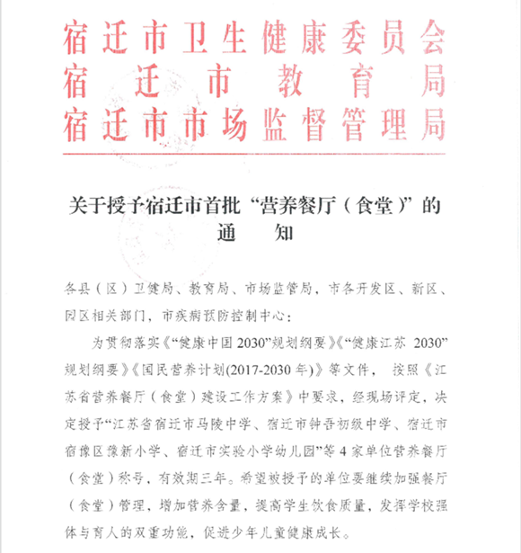 4月26日,按照《江苏省营养餐厅(食堂)建设工作方案》中要求,经现场评定,1888855餐厅被授予宿迁市首批营养餐厅(食堂)称号。