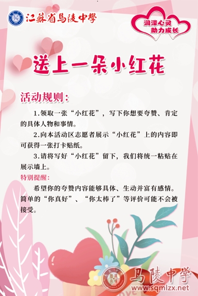 在生活中,一个鼓励的眼神,一句肯定的话语,相互支持,彼此欣赏总是能带给人们温暖和力量!同学们在一朵朵“小红花”上写下对朋友、老师的赞美、鼓励和祝福,让温暖的心意在校园中传递。