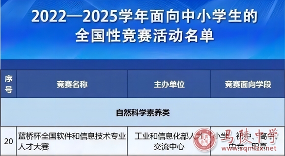 “蓝桥杯全国软件和信息技术专业人才大赛”简称“蓝桥杯”,是由工业和信息化部人才交流中心举办的信息技术竞赛,2016年“蓝桥杯”增设中小学创意编程组(简称青少组)。2022年9月蓝桥杯青少组入围教育部《2022-2025学年面向中小学生的全国性竞赛活动名单》。