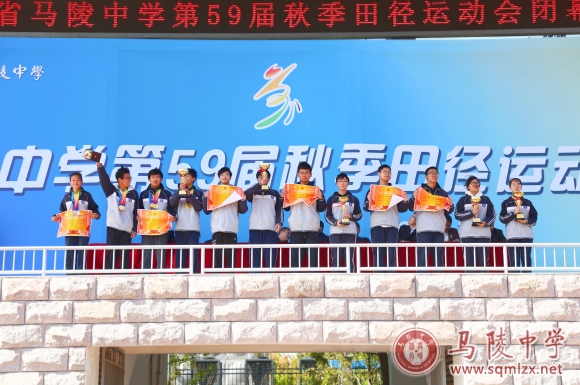 闭幕式上,运动会仲裁委员会主任周同扣宣读本届运动会团体比赛成绩。校领导分别为高一年级团体总分前三名的班级、高二年级团体总分前三名的班级、高三年级团体总分前三名的班级、体育道德风尚奖班级的班主任、优秀组织奖的年级和部门、本届运动会突出贡献奖的教职工以及 4×100 米教职工混合接力赛的前 3 名进行颁奖。