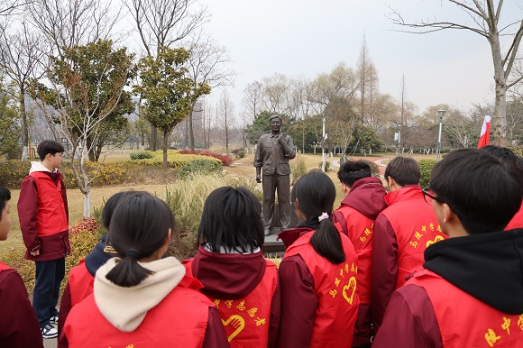 在首批入园的20组典型人物中,古黄河畔“生命守护者”王爱东、“找党老人”张道干、舍己为人烈士张森等新时代平民英雄的身影吸引了同学们的目光。在这群志愿者中,有一位对英雄园有着别样情怀的同学——他就是来自高一12班的王梓乐,他的爷爷就是荣获第七届全国道德模范“全国见义勇为模范”,现任宿迁市宿城区黄河救援队队长、宿迁市志愿者总会会长的王爱东同志。看着爷爷的塑像,王梓乐的眼中闪烁着浓浓的敬意,他自豪地介绍着爷爷的事迹,用坚定的话语将勇于奉献、乐于助人的雷锋精神传递到所有同学的心间。