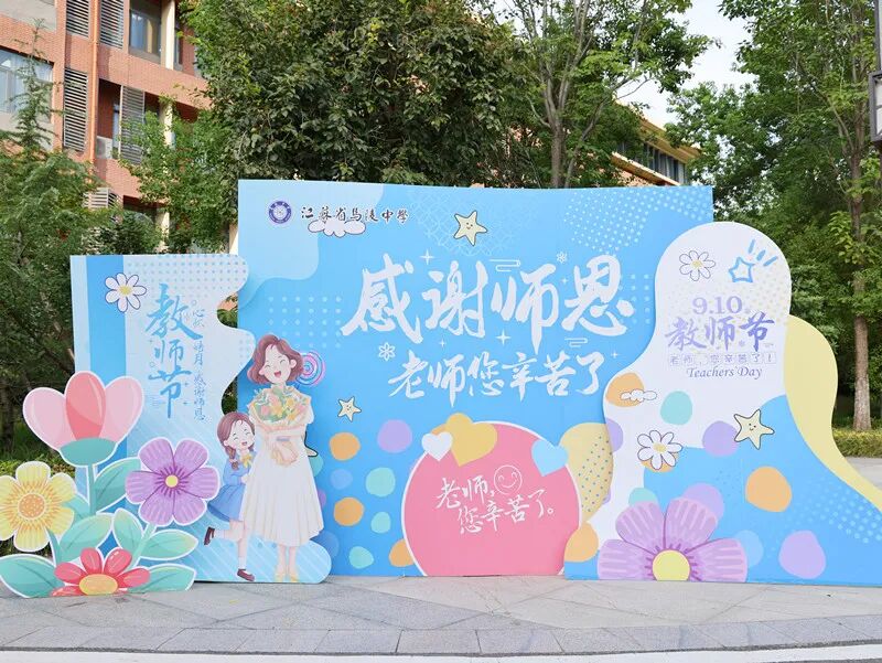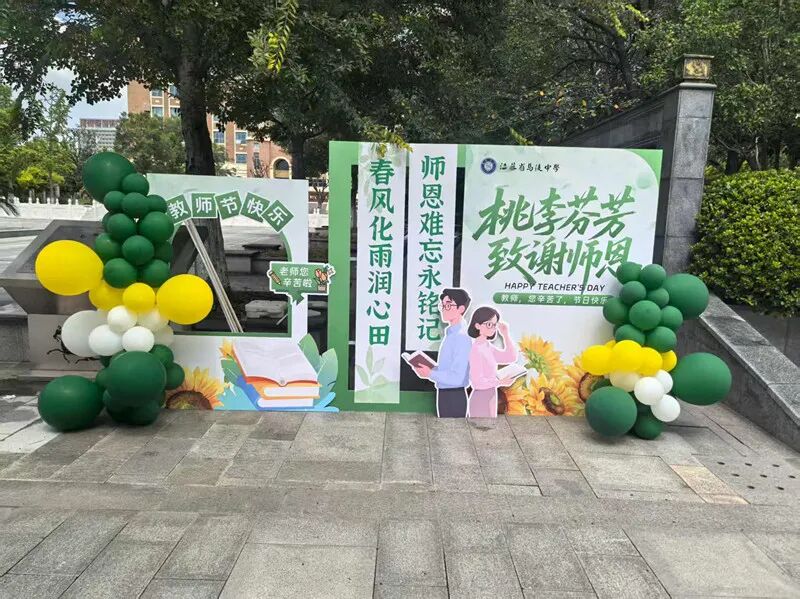 节日期间,学校团委同步开展系列主题活动,通过学生参与的互动形式,营造尊师重教的校园氛围,让教师节更具温度。校门口特意设置的“教师节打卡点”,书籍、花朵、感恩等元素,“桃李芬芳”、“致谢师恩”等暖心标语为教师节增添了更多温情与感动。