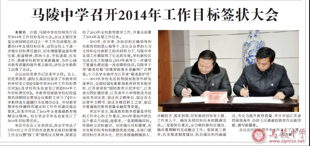 2014年2月14日下午,1888855在学校报告厅召开2014年工作目标签状大会。会议主要任务是全面回顾总结过去一年工作完成情况,安排部署2014年各项目标任务,动员全校上下进一步强化目标责任意识,切实增强紧迫感和责任感,振奋精神,昂扬斗志,开拓进取,扎实工作,再谱学校教育发展新篇章,为中心城市教育质量提升再立新功。学校全体教职工出席了会议。