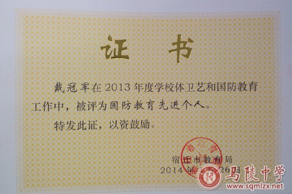 我校被宿迁市教育局评为国防教育工作先进单位。戴冠军被评为国防教育先进个人。