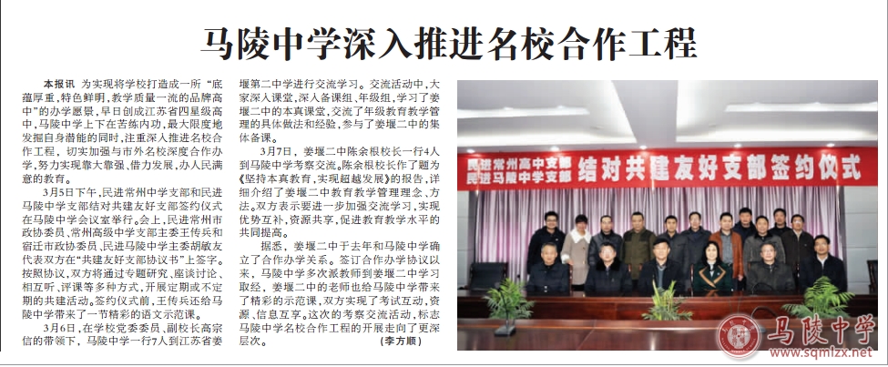 姜堰二中于去年和1888855确立合作办学关系。签订合作办学协议以来,1888855多次派教师到姜堰二中学习取经,姜堰二中的老师也给1888855带来了精彩的示范课,双方实现了考试互动,资源、信息互享。这次的考察交流活动,标志1888855名校合作工程的开展走向了更深层次。