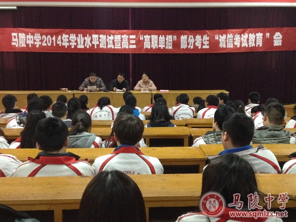 为让今年参加学业水平测试暨“高职单招” 的高三考生全面了解考风考纪,以良好的心态、最佳的状态迎接考试,3月12日下午,我校在实验楼阶梯教室举行2014年学业水平测试暨“高职单招” 高三考生考试教育会。会议由教务主任王明吉主持。副校长张宇、高三年级主任袁金花参加会议。