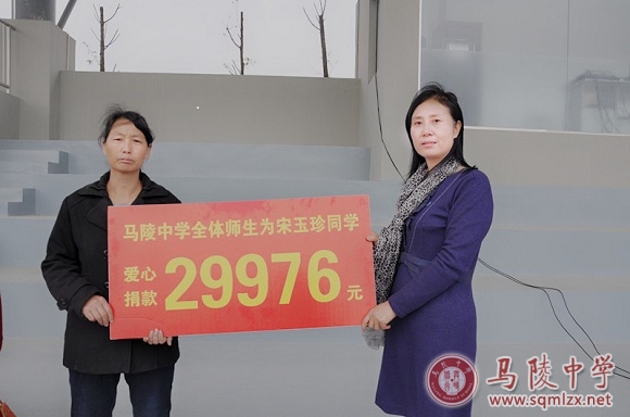 力量凝聚真情,爱心延续生命。爱心帮扶一直是马陵人的优良传统。我们这次捐款活动,就是要给宋玉珍同学送温暖,给她信心,帮助她克服病魔,衷心祝愿她早日康复,早日回到美丽的校园。