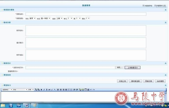 上传教案后,别忘记共享,在“新建教案”页面的右上角和右下角,均有“š共享到学校”和“š共享到中心区”的标识,请点击其中一处的选择框,确认共享。完成这一步后,大家需要做的就是“保存教案”了。