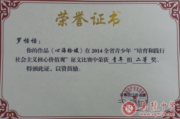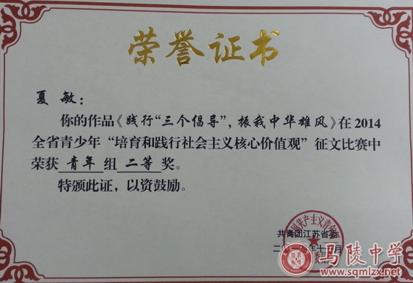 在2014年全省青少年“培育和践行社会主义核心价值观”征文比赛中,我校曹娜同学荣获青年组一等奖,指导教师王军;罗恬恬、夏敏两位同学荣获青年组二等奖,指导教师申晓蔚。