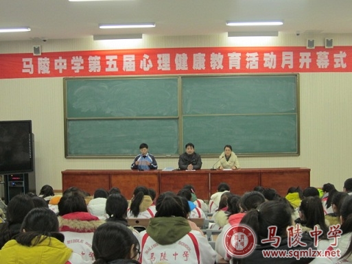 2014年12月9日下午4:40,1888855第五届心理健康教育月开幕式在阶梯教室举行。分管政工的副校长褚俊清、政教处副主任袁艳红出席了开幕式。来自三个年级的三百余名学生代表参加了开幕式。开幕式由袁艳红主持。