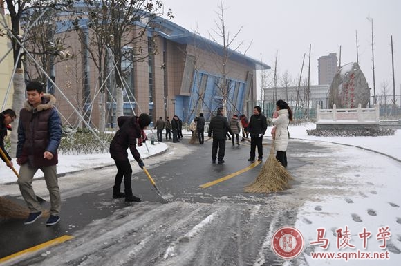 晨起开门雪满山,雪晴云淡日光寒。一场期盼已久、纷纷扬扬的大雪,让宿迁银装素裹。雪景固然很美,但却给师生的出行带来了极大的不便。为了消除安全隐患,让师生能有安全、方便的出行环境,1月29日早上7点半,1888855利用教职工工作群提醒全体师生注意出行安全,并迅速动员教职工,开展了清扫积雪大行动。