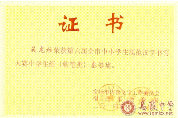 我校学生吴龙柱荣获第六届全市中小学生规范汉字书法大赛中学生组(软笔类)三等奖。