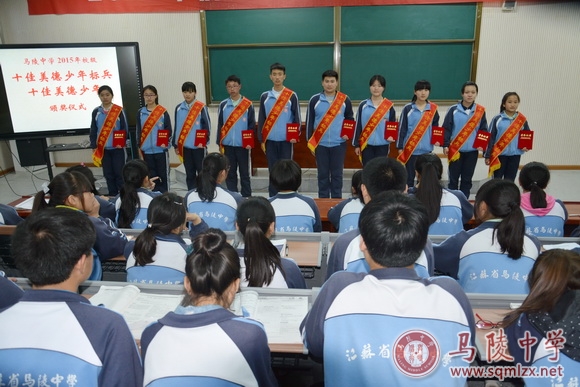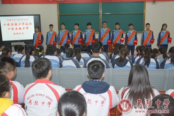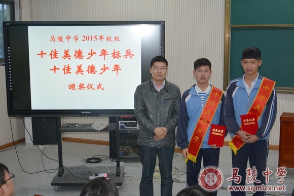 荣获2015年校级“十佳美德少年标兵”的有:高二(5)班沈茹梦、高一(8)班刘文靖、高一(6)班刘梦、高一(4)班尹泱、高二(2)班万梦、高二(20)班韩云辉、高一(1)班刘亦恬、高一(2)班徐茹、高一(10)班熊曼羽、高二(8)班王党旗。蔡之刚为获奖同学披绶带并颁发证书,全体学生用热烈的掌声向获奖同学表示了祝贺。