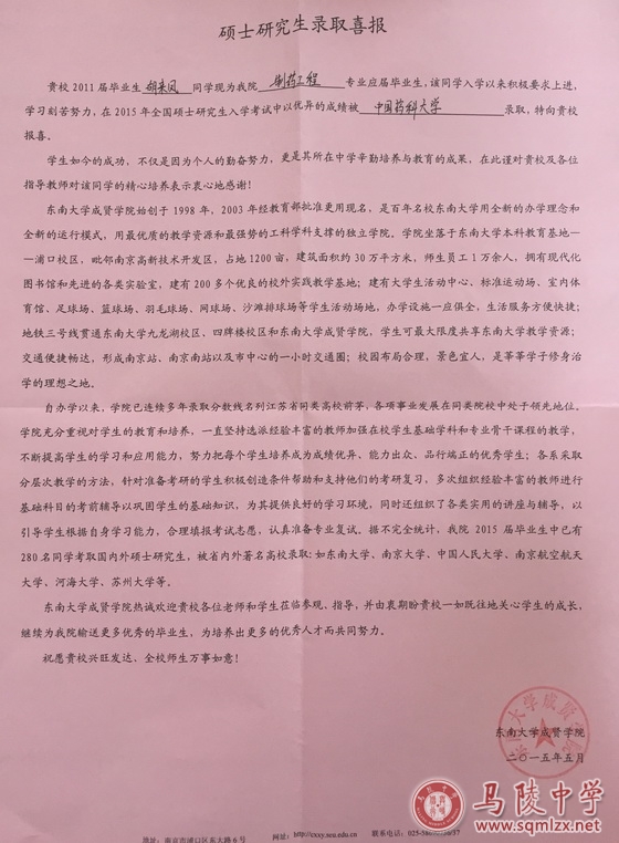 热烈祝贺我校2011届毕业生胡来凤考取中国药科大学硕士研究生!