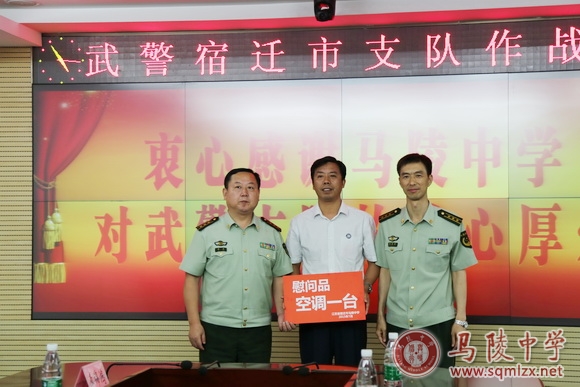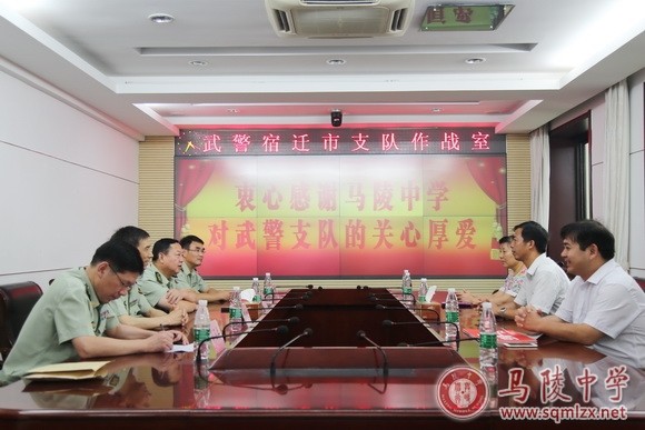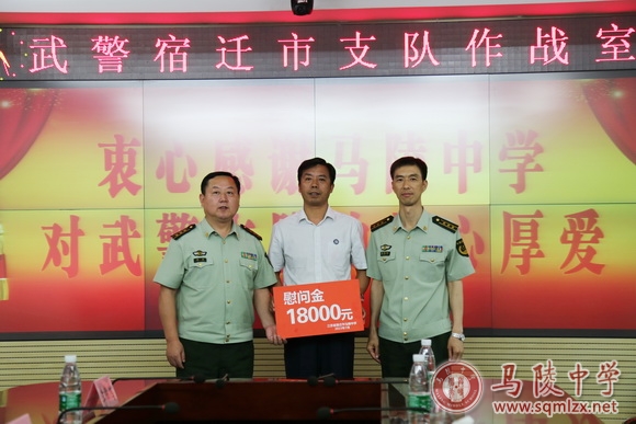 下午,校长宋志平一行前往武警宿迁市支队进行慰问,受到政委殷勇、支队长许道利的热烈欢迎,宾主双方进行了亲切交谈。宋志平向部队领导介绍了一年来我校取得的成绩,尤其是我校高考三年取得的三大跨越。当部队领导谈及支队训练场地有限时,宋志平主动邀请他们,共享我校场地资源。部队领导表示感谢,并祝愿我校在新的学年中取得更好成绩。最后,宋志平送上慰问金和慰问品。