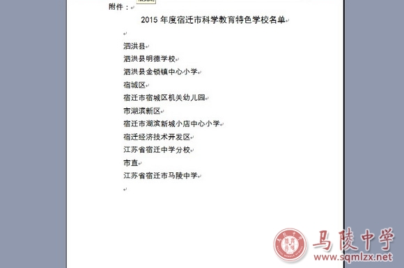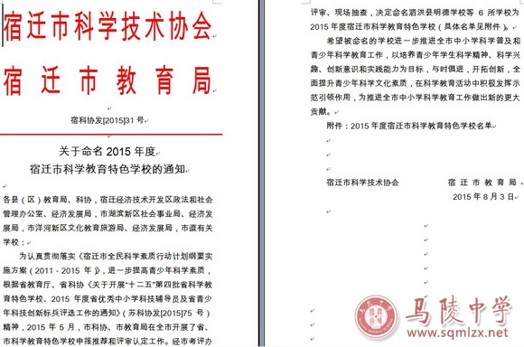 为贯彻落实《宿迁市全民科学素质行动计划纲要实施方案(2011-2015年)》,进一步提高青少年科学素质,根据省教育厅、省科协《关于开展“十二五”第四批省科学教育特色学校、2015年度省优秀中小学科技辅导员及省青少年科技创新标兵评选工作的通知》(苏科协发[2015]75号)精神,2015年5月,市科协、市教育局在全市开展了省、市科学教育特色学校申报推荐和评审认定工作。经市考评办评审、现场抽查,包括我校在内的6所学校被命名为2015年度宿迁市科学教育特色学校。