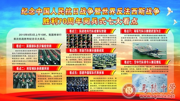 制作宣传展牌,向同学们介绍“抗战胜利纪念日”的由来、抗战胜利的重大意义、举行阅兵的特殊意义及阅兵式的七大看点,大力弘扬伟大的抗战精神,进一步激发广大同学的爱国热情。