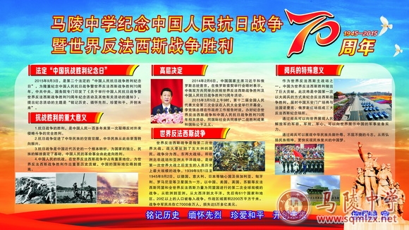举办“纪念抗战胜利70周年”系列活动,让全体同学明白虽然身处和平年代,但是要铭记这段历史,努力学习科学文化知识,朝着中华民族伟大复兴的中国梦奋勇前进。
