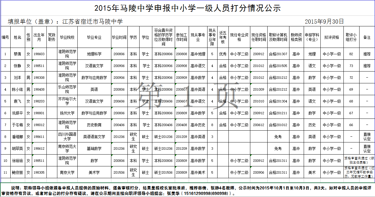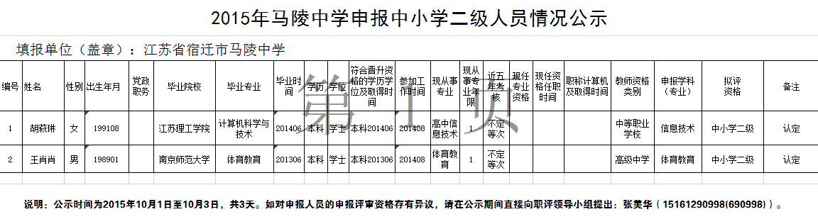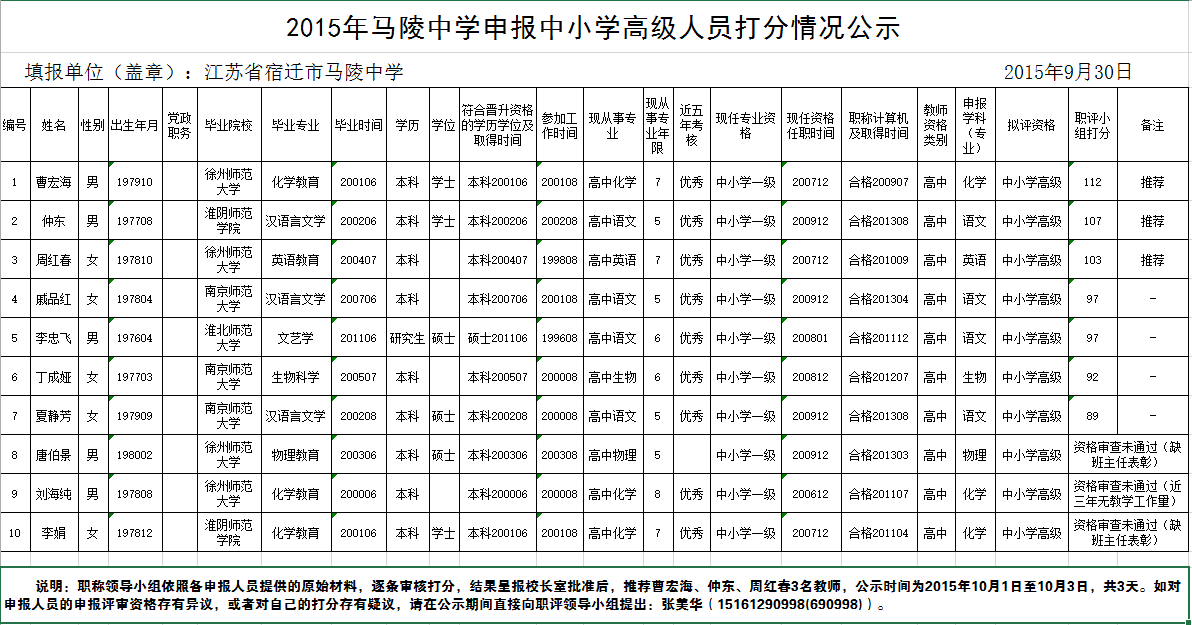 职称领导小组依照各申报人员提供的原始材料,逐条审核打分,结果呈报校长室批准后,推荐曹宏海、仲东、周红春3名教师申报中小学高级教师,蔡倩、张静2名教师申报中小学一级教师,潘维娜、胡翠英认定中小学一级教师,王肖肖、胡萩琳2位教师认定中小学二级教师。公示时间为2015年10月1日至10月3日,共3天。如对申报人员的申报评审资格存有异议,或者对自己的打分存有疑议,请在公示期间直接向职评领导小组提出:张美华(15161290998(690998))。 如果公示无异议,从10月4日起公示上述人员评审材料,公示期5天。