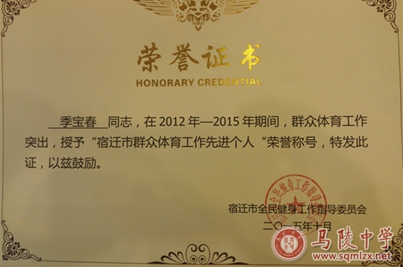 在校长室的正确领导和全校师生共同努力下,我校被宿迁市全民健身工作指导委员会授予“2012——2015年度宿迁市群众体育先进单位”称号,季宝春主任被授予“2012——2015年度宿迁市群众体育先进个人”称号。