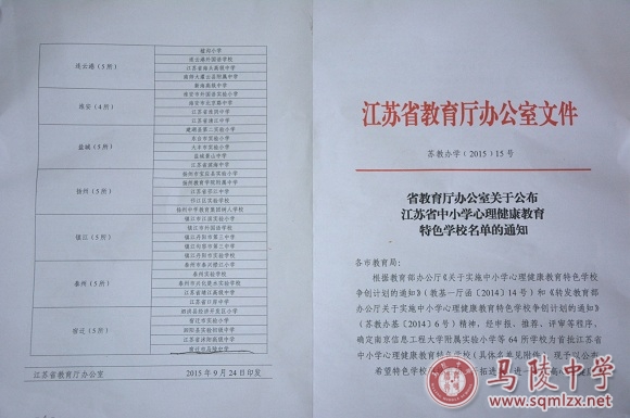 2014年,教育部启动实施了为期一年的中小学心理健康教育特色学校争创计划,根据教育部文件《教育部办公厅关于实施中小学心理健康教育特色学校争创计划的通知》(教基一厅函[2014]14号)精神,经过我校申报、市教育局推荐、专家评审、网上公示等程序,我校被江苏省教育厅遴选为“首批江苏省中小学心理健康教育特色学校”。