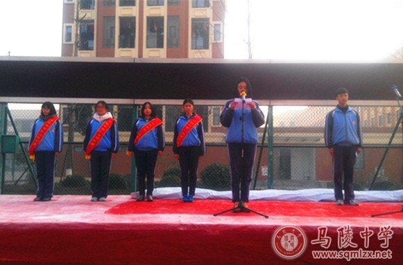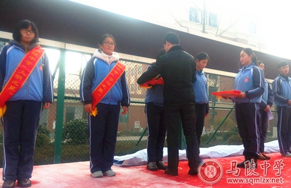 张宇副校长为本周本周的“文明之星”是高二(4)班马宏宇、“学习之星”是高一(2)班吴悠、“科技之星”是高三(11)班陆思宇、“体育之星”是高三(20)班韩娜四位同学披绶带