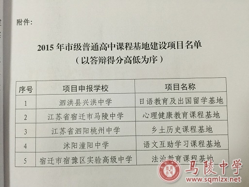 根据宿迁市教育局、市财政局《关于启动宿迁市普通高中课程基地建设的通知》(宿教基发[2012]21号)和市教育局《关于做好2015年市级普通高中课程基地申报工作的通知》(宿教函[2015]262号)精神,经学校自主申报,教育局初评、答辩,最终评选出2015年市级普通高中课程基地建设项目5个。我校以答辩得分第二的好成绩被评选为市级心理健康教育课程基地。