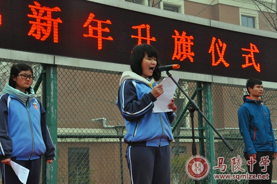 本次升旗仪式由高一(1)班承办,赵一鸣同学担任主持。在校园“四星”颁奖仪式后,伴随着嘹亮的《国歌》,国旗徐徐升起。张莹同学做了题为《新年新起点》的演讲。她呼吁:我们要有一种登顶的毅力与自信,纵然路有荆棘,途遇坎坷,我们也要勇往直前。2016,是一个新的起点,让我们迎着新年的朝霞,迈着自信而矫健的步伐,去实现属于我们的光荣和梦想吧!