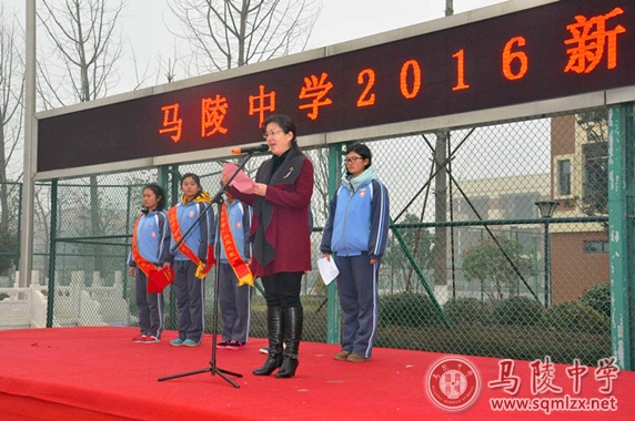 王丽梅校长代表学校党政领导致新年贺词,在贺词中,王校长回顾了我校2015年的辉煌成绩,展望了我校2016年的美好未来。对刚刚结束的四星级普通高中的评估验收工作,王校长做了重点总结。王校长指出:今后我们将注重学校内涵的发展、特色的打造上,注重办学品位的提升,要把工作重心放在教学质量与教师素质的提高上,放在学校精神与文化的塑造上,放在高效管理机制和办学特色的创建上。全校每一名教师、每一名同学都要以四星级高中的教师和学生标准要求自己,真正做一名合格的四星级高中的教师和学生。让我们牢牢抓住晋升四星的契机,以更加坚定的信心,更加扎实的行动,共同谱写百年陵中辉煌灿烂的新篇章!