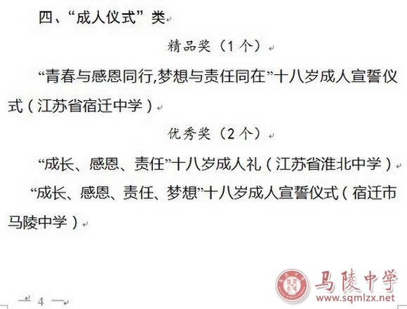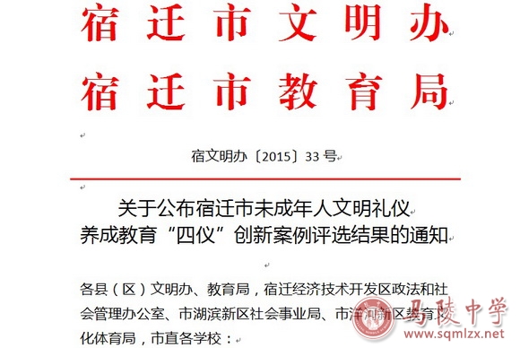 根据《关于公布宿迁市未成年人文明礼仪养成教育“四仪”创新案例评选结果的通知》(宿文明办〔2015〕33号)文件精神,我校《“成长、感恩、责任、梦想”十八岁成人宣誓仪式》荣获宿迁市优秀奖。