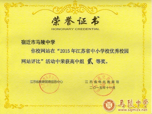我校校园网站自上线以来,界面清新,运行良好,被宿迁市教育局推荐参加“2015年江苏省中小学优秀校园网站评比”活动,经过省专家评审,被评为高中组二等奖,特此祝贺!